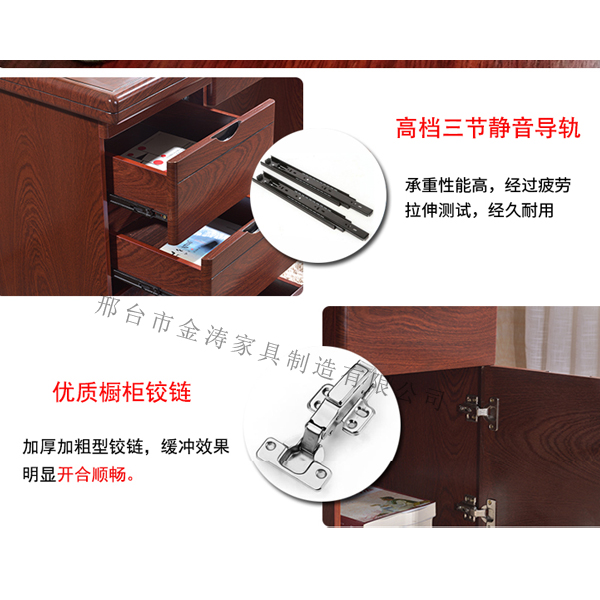 材质:采用优质品牌E1级中密度纤维板,木材含水率≤7%,密度≥0.76g/cm³,吸水厚度膨胀率≤10%,内结合强度≥0.6MPa,静曲强度≥30MPa,弹性模量≥3500MPa,表面结合强度≥1.0MPa;甲醛释放量≤0.11mg/m³,通过GB/T 11718-2009 《中密度纤维板》、GB 18580-2017《室内装饰装修材料 人造板及其制品中甲醛释放限量》标准。 油漆:采用优质品牌环保油漆,经过五底三面油漆工序,木纹纹理清晰,色泽均匀、光滑耐用;挥发性有机化合物 VOC≤570g/L,苯质量分数≤0.02%,甲苯、二甲苯、乙苯质量分数≤20%,固化剂中游离甲苯二异氰酸脂(TDI)质量分数≤0.2%,符合 HJ/T 414-2017 《环境标志产品技术要求 室内装饰装修用溶剂型木器涂料》;卤代烃含量≤0.02%, 符合GB 18581-2009 《室内装修装饰材料 溶剂型木器涂料中有害物质限量》标准;饰面:采用天然实木皮,厚度≥0.8mm,含水率≤11%;符合GB/T 13010-2006 《刨切单面》标准;  封边:采用优质封边条,含水率≤12.5%,甲醛释放量≤1.0mg/L,符合 QB/T 4463-2013 《家具用封边条技术要求》标准;胶水:选用国内优质品牌环保贴面胶,粘性强,久不分层,具有防水性、防潮性、耐油性、耐撞性等特点,游离甲醛≤0.10g/kg,苯含量≤0.10g/kg,甲苯+二甲苯≤0.05g/kg,二氯甲烷≤0.05g/kg,总挥发性有机物≤70g/L;符合 GB 18583-2008 《室内装饰装修材料 胶粘剂中有害物质限量》。   五金配件:采用优质品牌五金配件,无锈蚀,具有足够的承载能力、耐腐蚀能力。规格:1600W*800D*760H